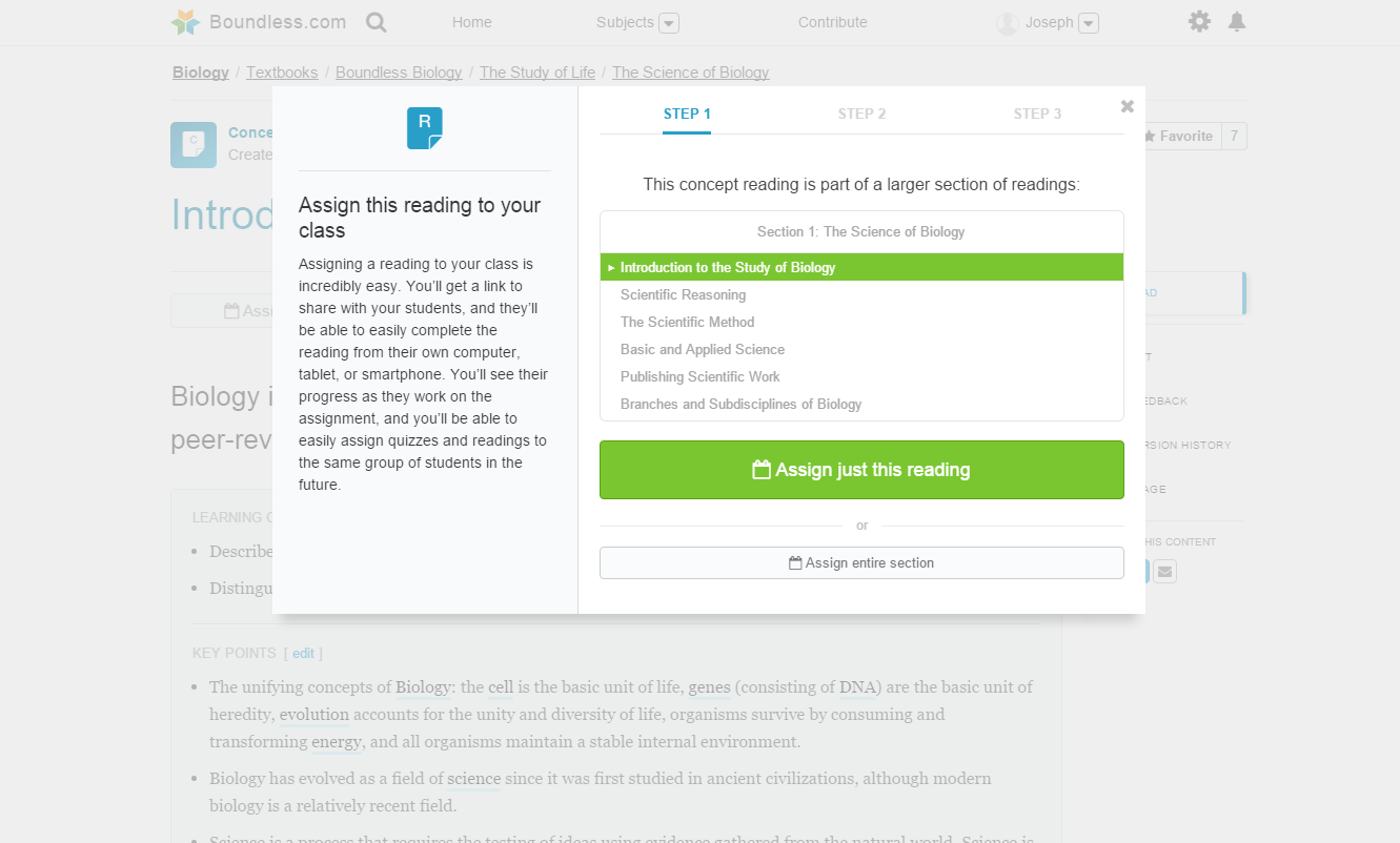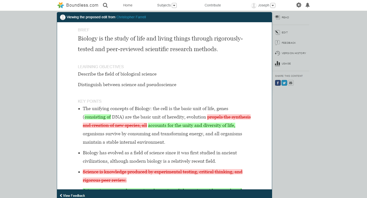 Boundless is an ed-tech company who offers a collaboration platform for teachers. Educators can author and edit entire books, or create chapters, quizzes, and assignments. When educators propose changes to existing content, changes are passed through a git-like versioning system. They are able to review, revert, and jump through version histories as they collaborate. After edits are complete, they can even use boundless to assign the content to their students, then track progress and grades.